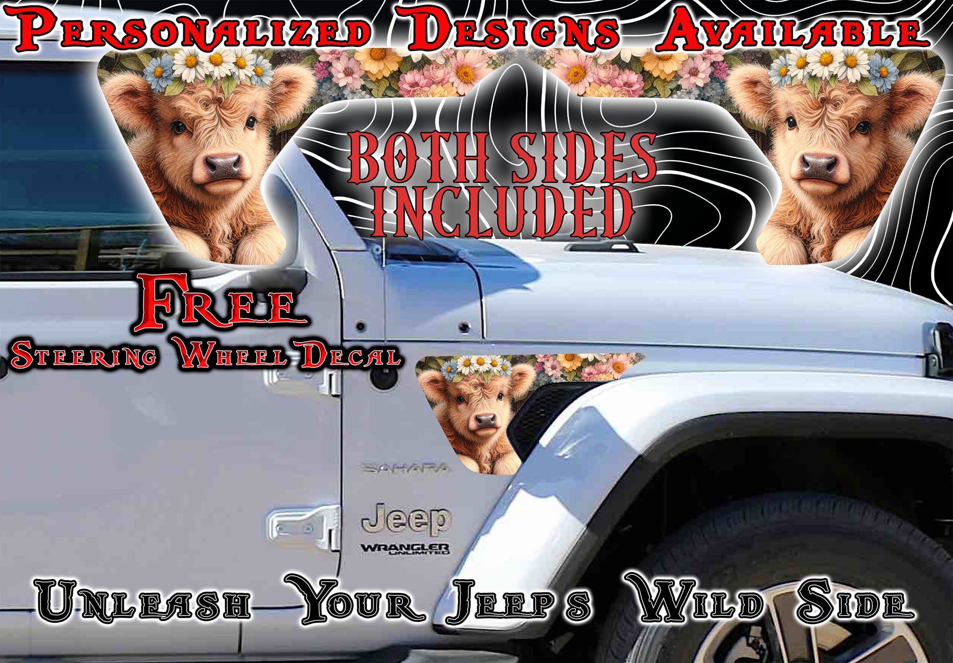 Give your JL or JT (2018 or newer) a fun twist with this Highland cow fender vent decal! It's an easy way to add some quirky personality and charm to your ride without any fuss. Perfect for Jeep lovers who want to stand out and show a little wild side while keeping things cool and stylish.